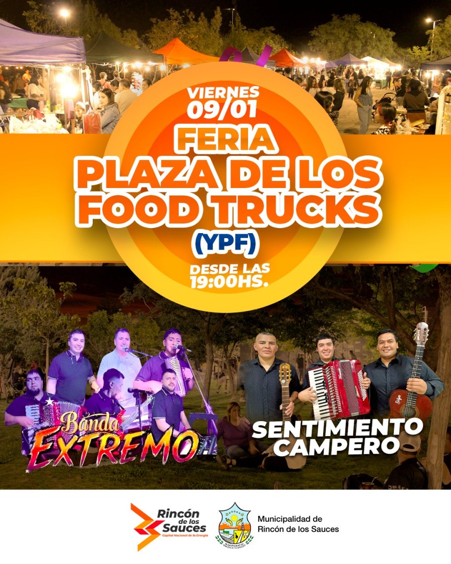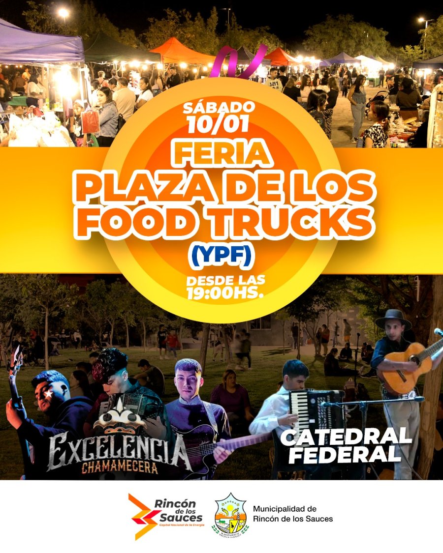 El viernes 9 y sábado 10 de enero, desde las 19 horas, se realizará en la Plaza YPF, la Feria de los Food Trucks, eventos que contarán con espectáculos en vivo, feriantes y carritos de comida para disfrutar en familia.