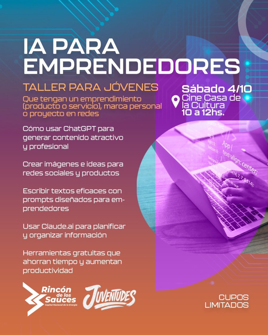 La Municipalidad de Rincón de los Sauces, a través del área de Juventudes, invita a participar del taller “IA para Emprendedores”, que se realizará el sábado 4 de octubre de 10 a 12 horas en el Cine Casa de la Cultura.