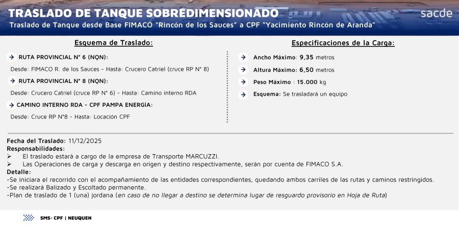 La empresa SACDE informó que este 11 de diciembre de 2025 se realizará el traslado de un tanque sobredimensionado desde la base FIMACO, en Rincón de los Sauces, con destino al CPF del yacimiento Rincón de Aranda.