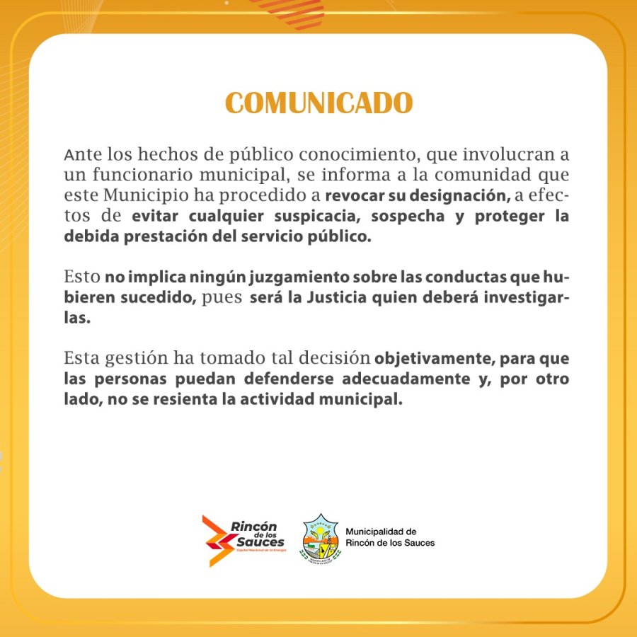 La Municipalidad de Rincón de los Sauces informó a la comunidad que decidió revocar la designación de un funcionario municipal involucrado en hechos de público conocimiento. La medida fue adoptada con el objetivo de evitar cualquier tipo de suspicacia o sospecha y garantizar la correcta prestación del servicio público.